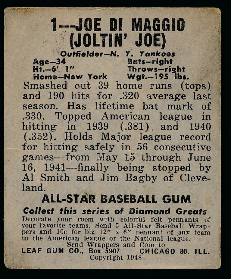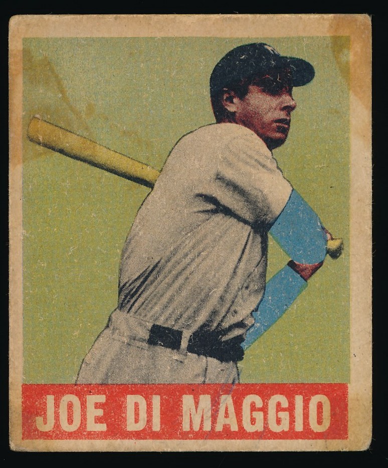 1949 Leaf #1 Joe DiMaggio (Yankees). Current Beckett Value $3000. Please see scan for details regarding the condition of the card.
