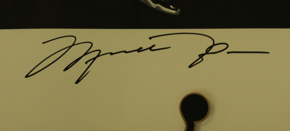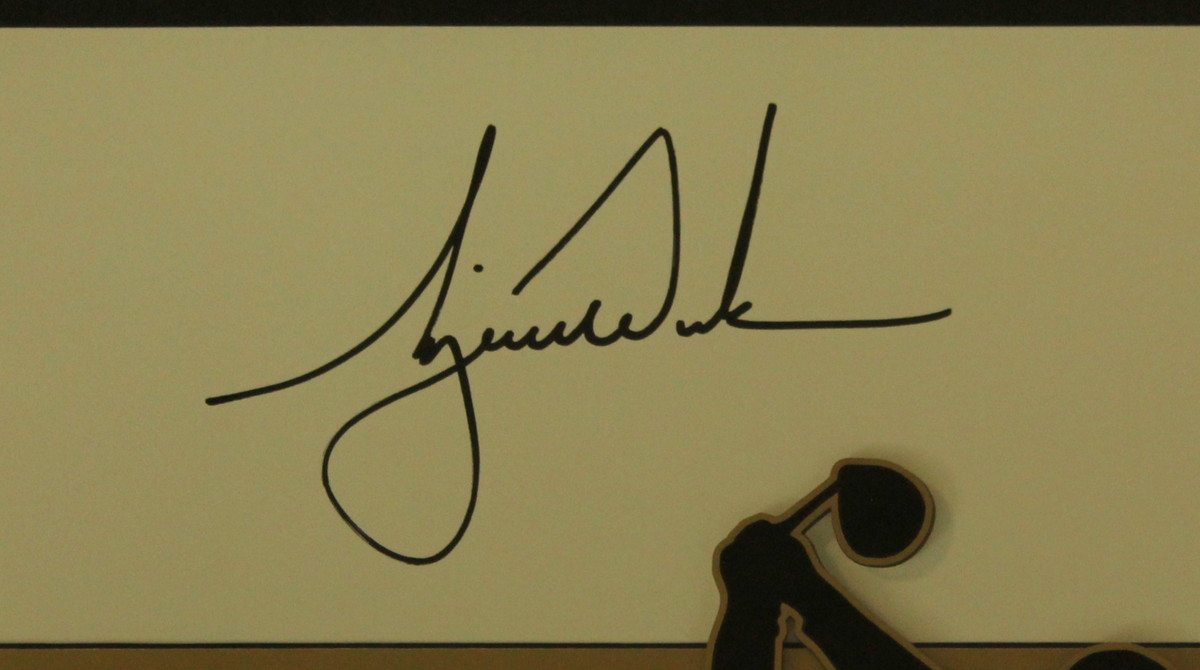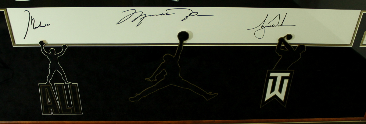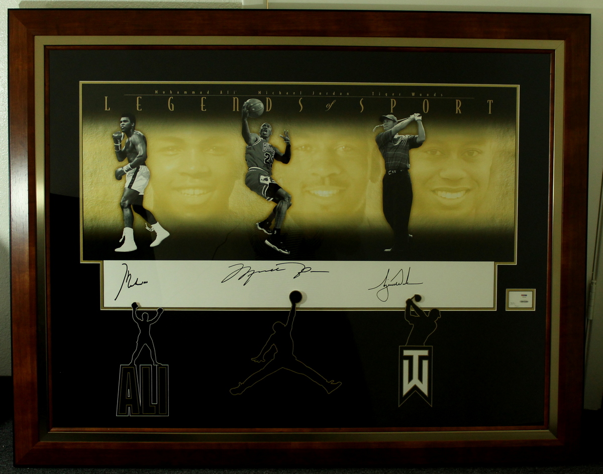 This custom framed piece entitled "Legends of Sport" is hand-signed in black felt tip pen by three of the greatest athletes of all time. The autographs include Michael Jordan, Tiger Woods, and Muhammad Ali. The piece is limited edition and hand-numbered #328/500.