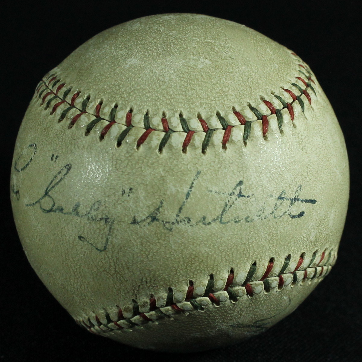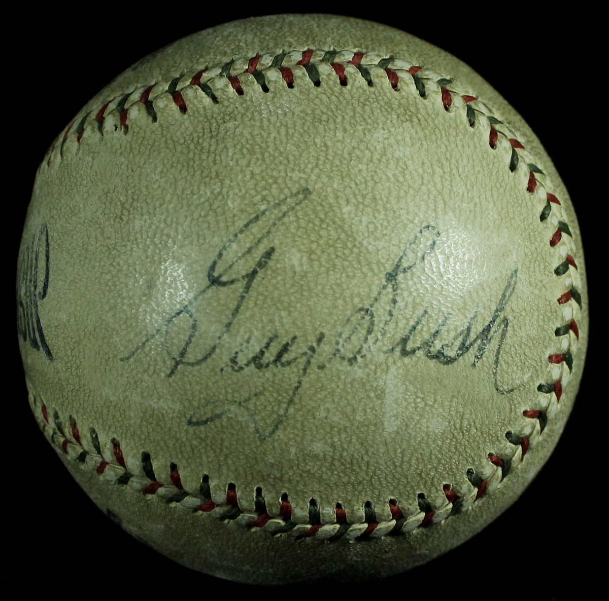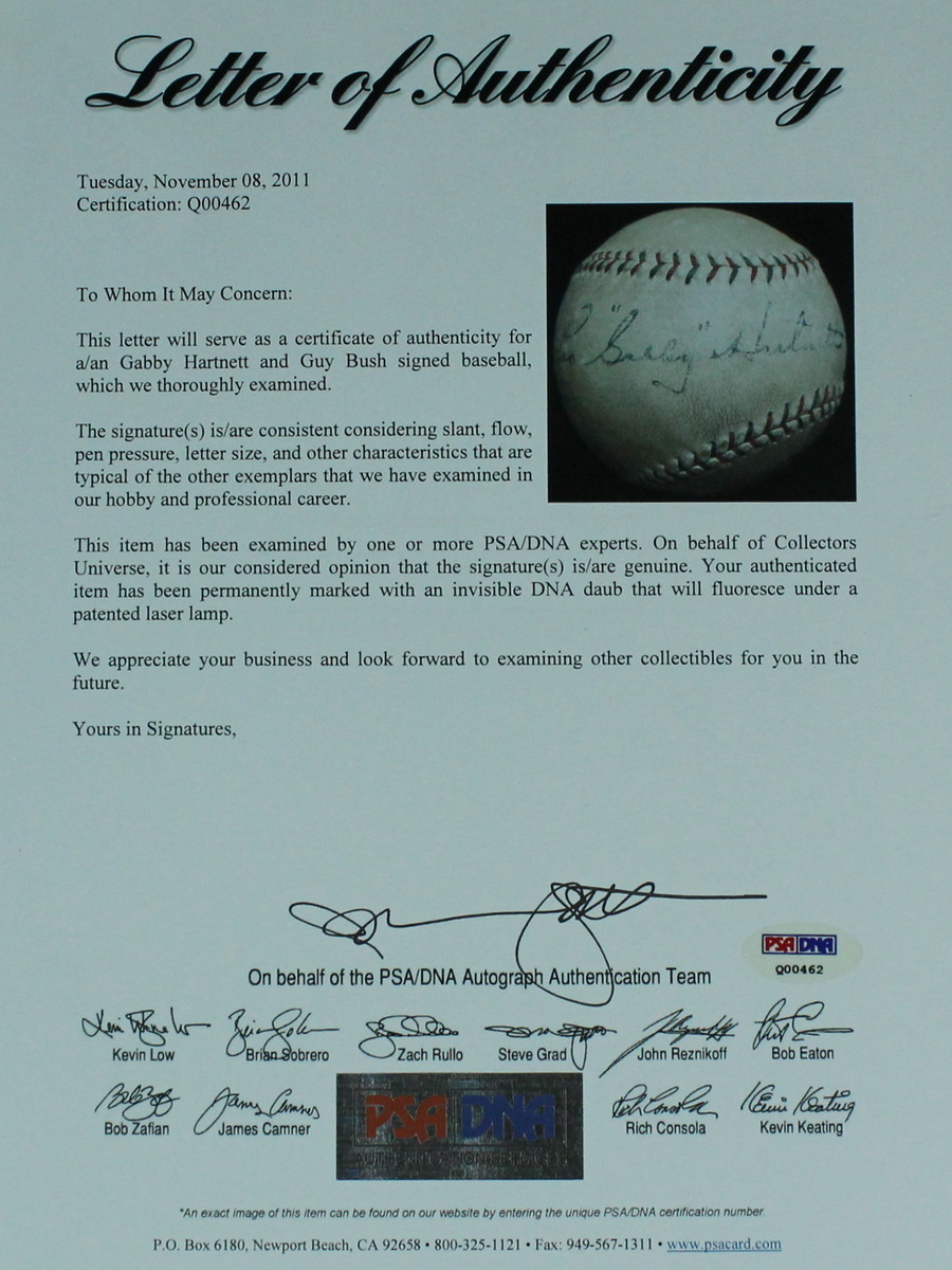 Official League Baseball. Hand-signed in blue ink pen by Gabby Hartnett (D 1972, Cubs HOF) and Guy Bush (D 1985, Cubs). 1920's Chicago Cubs battery mates. Guy Bush is also famous for serving up Babe Ruth's last two home runs (#713 and #714). The autographs includes an official PSA/DNA hologram and matching LOA for authenticity purposes.