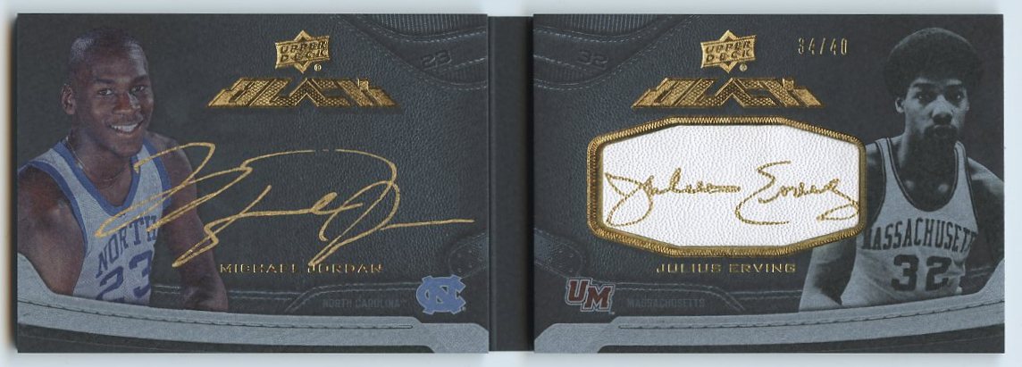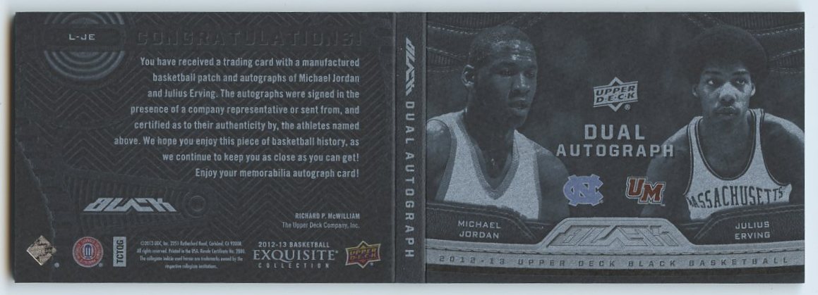 2012-13 Exquisite Collection UD Black Leather Autographs Dual #JE Michael Jordan / Julius Erving. The card is serially numbered #34/40. Please see the scans below for details on the condition of the card.