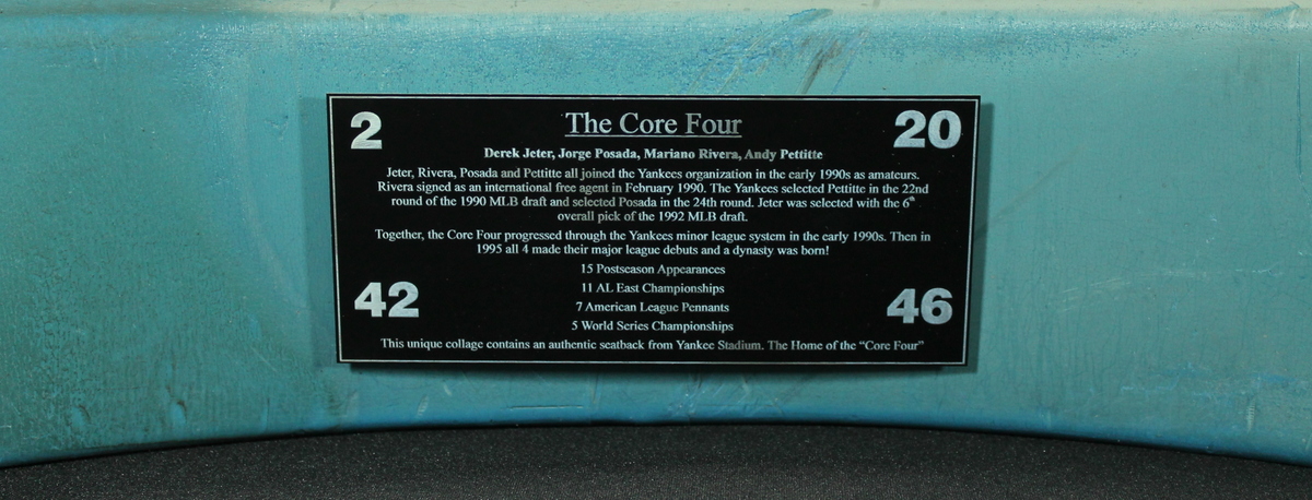 A rare chance to own a piece of baseball history! This authentic stadium seat back came directly from Yankee Stadium, home of the New York Yankees. Old Yankee Stadium stood from April 18, 1923 - September 21, 2008. The seat comes with a custom memorial plaque attached. Also includes attached photos of "The Core Four" including Derek Jeter, Jorge Posada, Mariano Rivera and Andy Pettitte. The piece includes a Steiner COA for authenticity purposes.