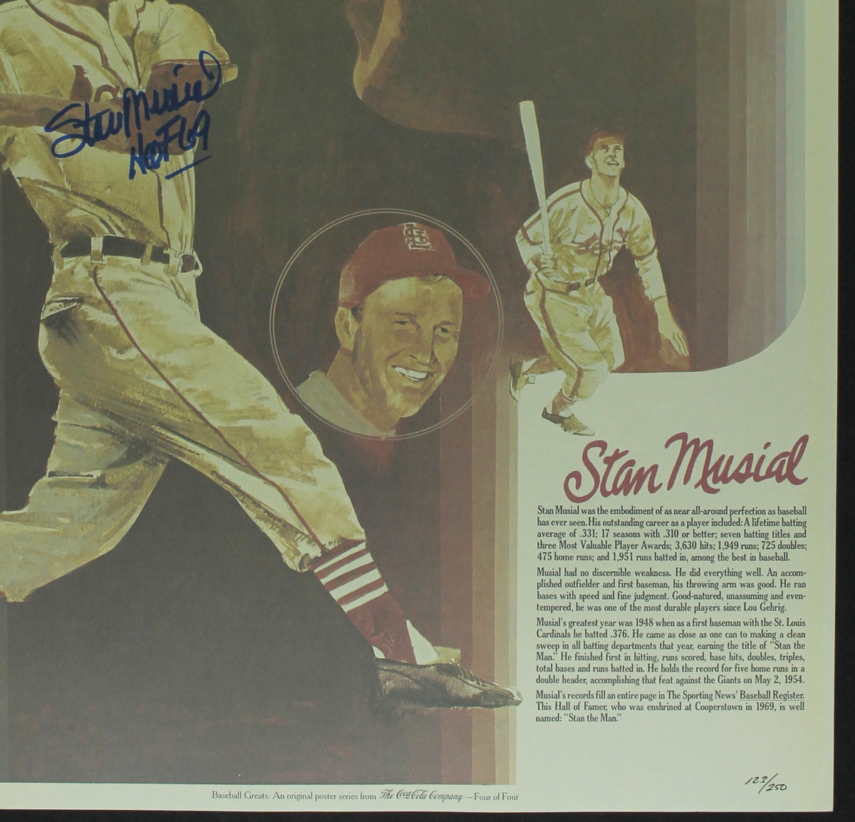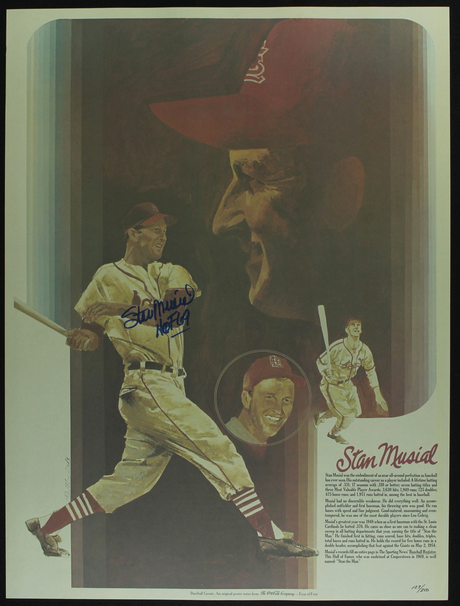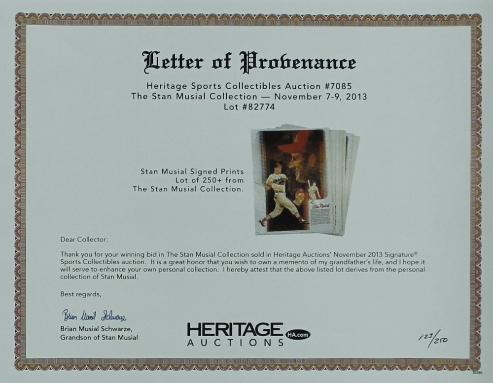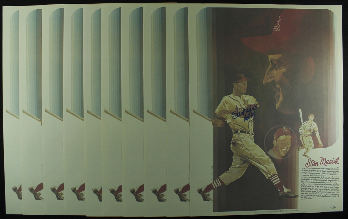 Lot of (10) 18" x 24" Lithographs hand-signed in blue felt-tip pen by Stan Musial (Cardinals HOF, D 2013). Each lithograph is limited edition to a total of 250. The autographs each include an official Heritage LOA for authenticity purposes.