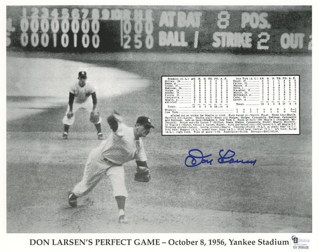8x10 glossy photo hand-signed in blue felt tip pen by Don Larsen. Autograph includes a Global Authentics COA for authenticity purposes.
