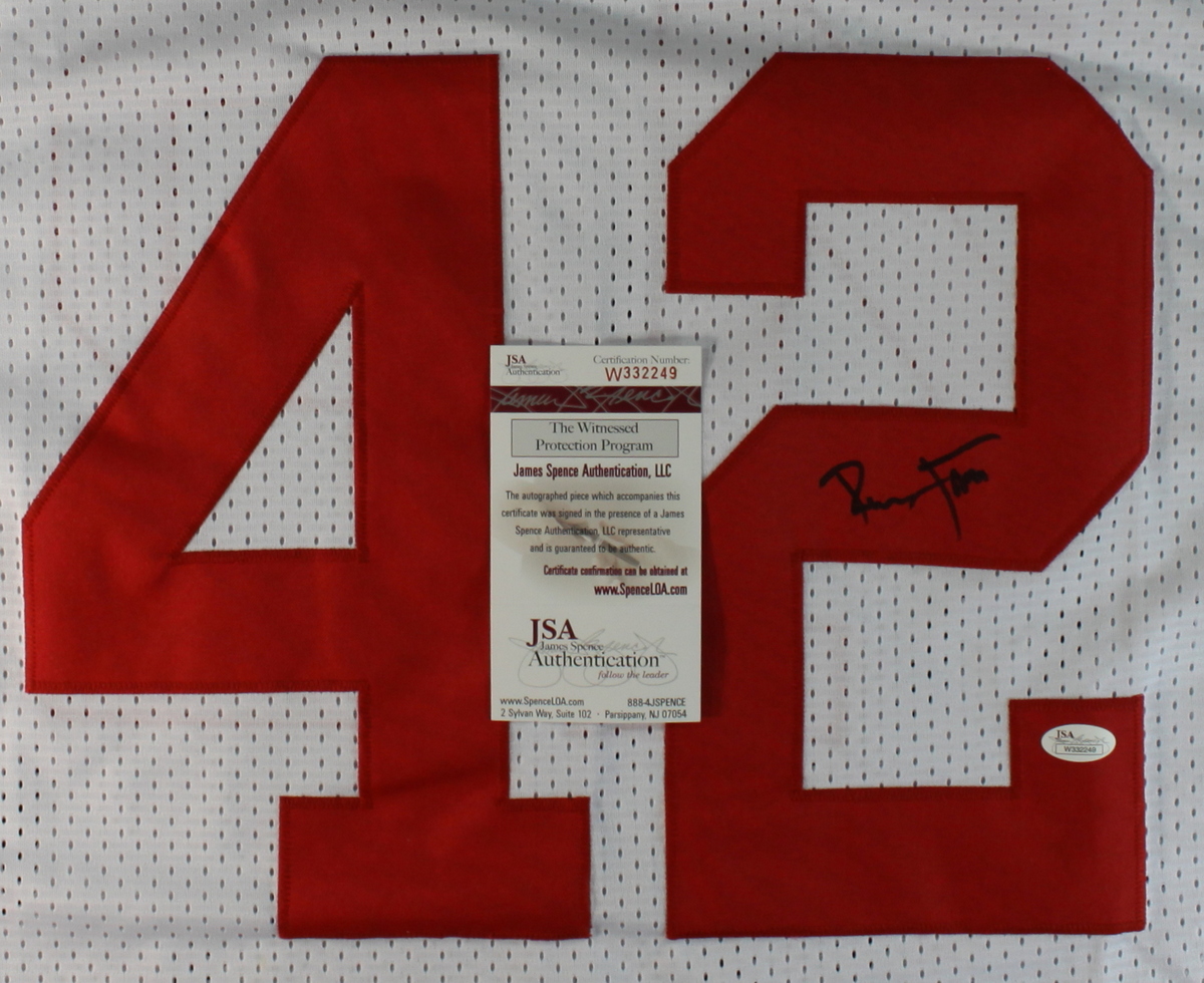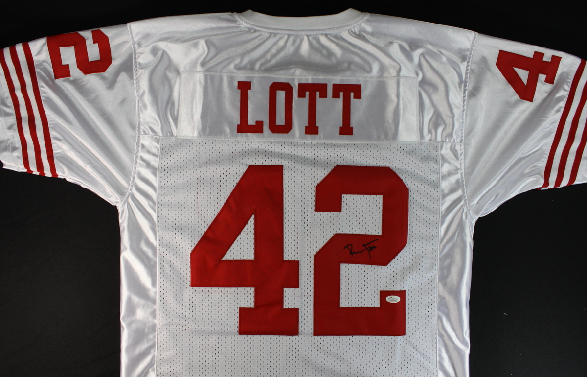 On-field style jersey. Everything is sewn on, size XL. Hand-signed in black felt tip pen by Ronnie Lott. Autograph includes a James Spence Authentication (JSA) COA for authenticity purposes. The signing of the item was witnessed by JSA.