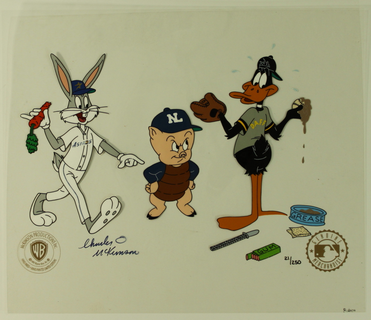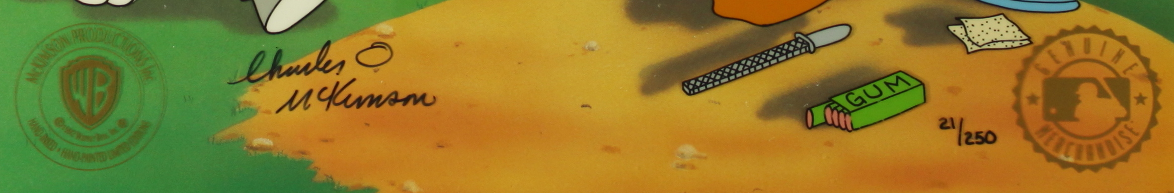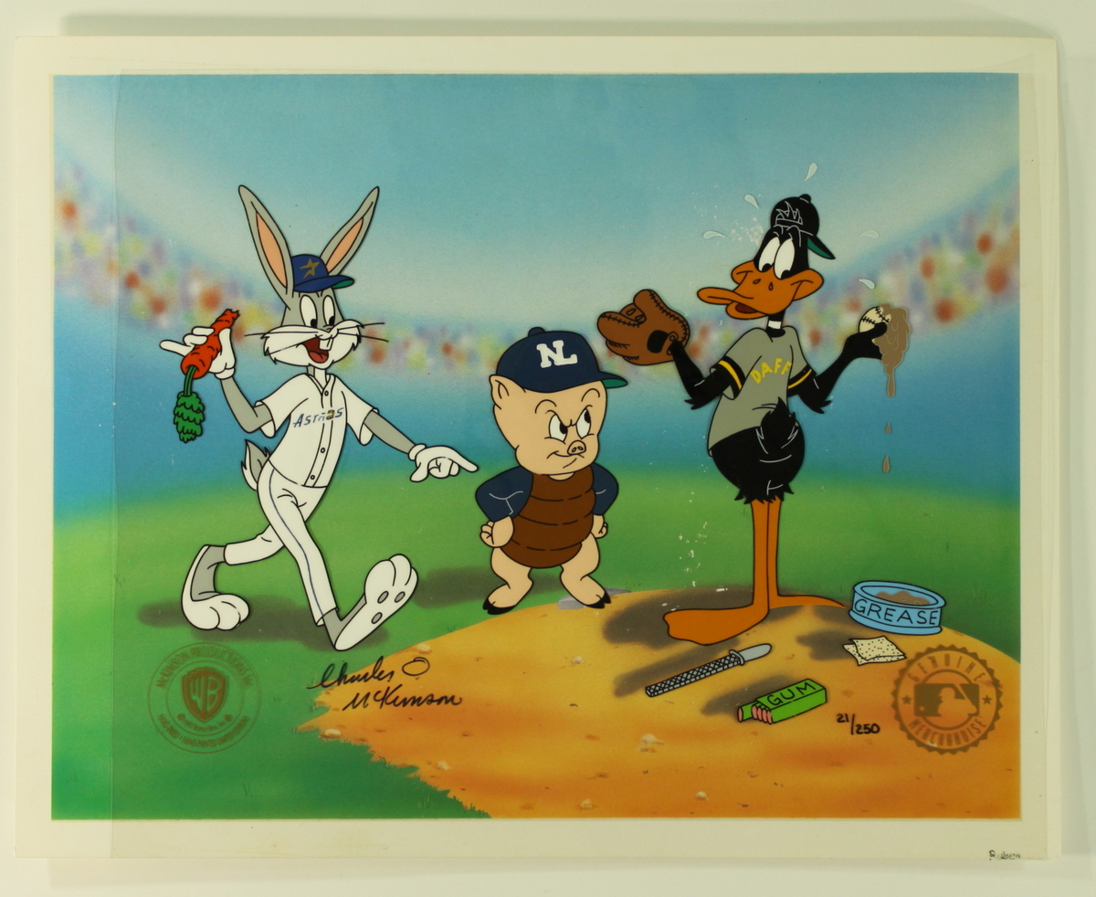 Rare limited edition (#21/250) hand-painted warner bros. animation cel. The cel is hand-signed by animator Charles McKimson (D 1999). Includes a laser copy background for display purposes. Cel measures approximately 12.5" x 10.5". Includes a Warner Bros. seal in the lower left corner. Also includes an authenticity guarantee and LOA from Pristine Auction.