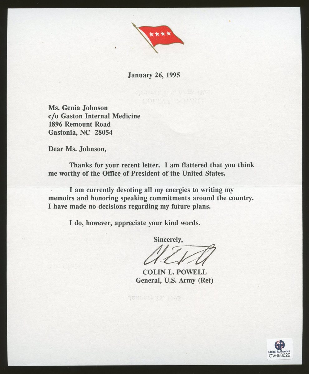 Letter is dated January 26, 1995. The letter has been hand-signed in black ink by Colin Powell. Autograph include a Global Authentics (GA) hologram and matching COA for authenticity purposes.