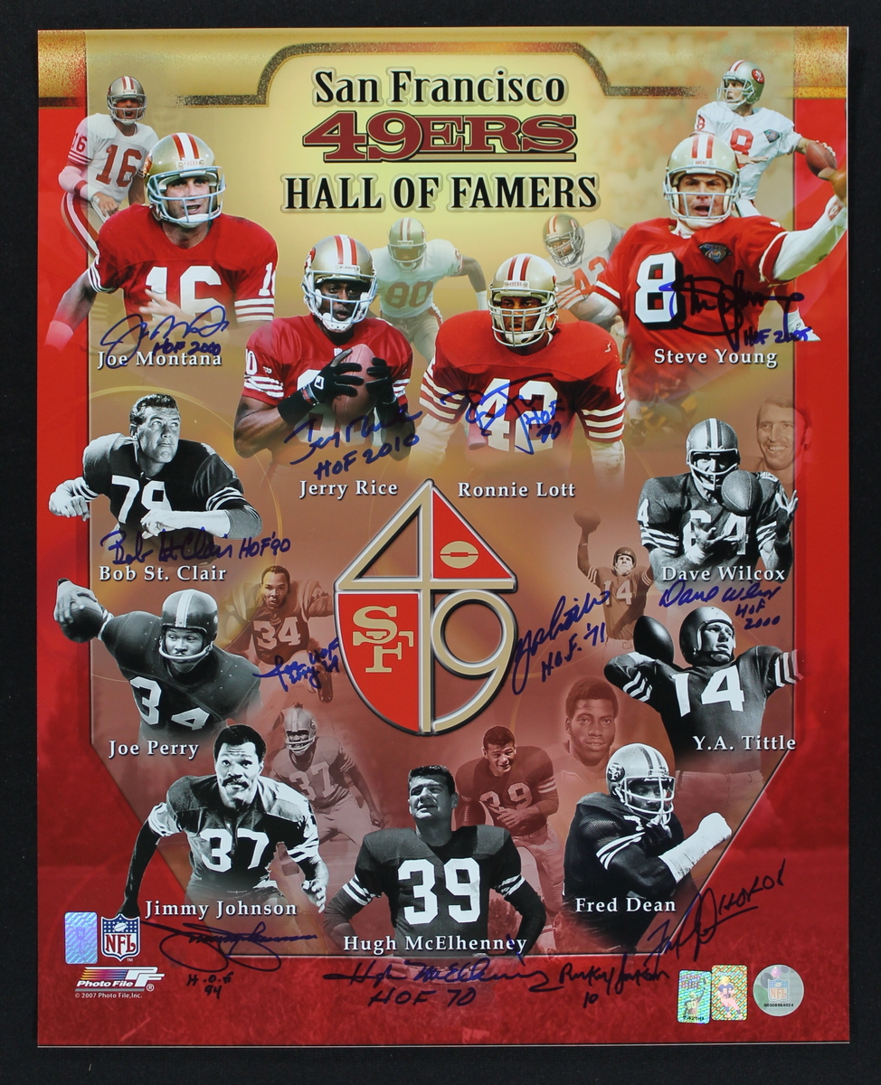 49ers HOF 16x20 photo hand-signed and inscribed in blue felt tip pen by Joe Montana, Jerry Rice, Ronnie Lott, Steve Young, Bob St. Clair, Dave Wilcox, Y.A. Tittle, Joe Perry, Jimmy Johnson, Hugh McElhenney, Rickey Jackson & Fred Dean. The piece includes a Joe Montana hologram, Jerry Rice hologram & Steve Young hologram for authenticity purposes. The signing of this item was witnessed by GTSM.